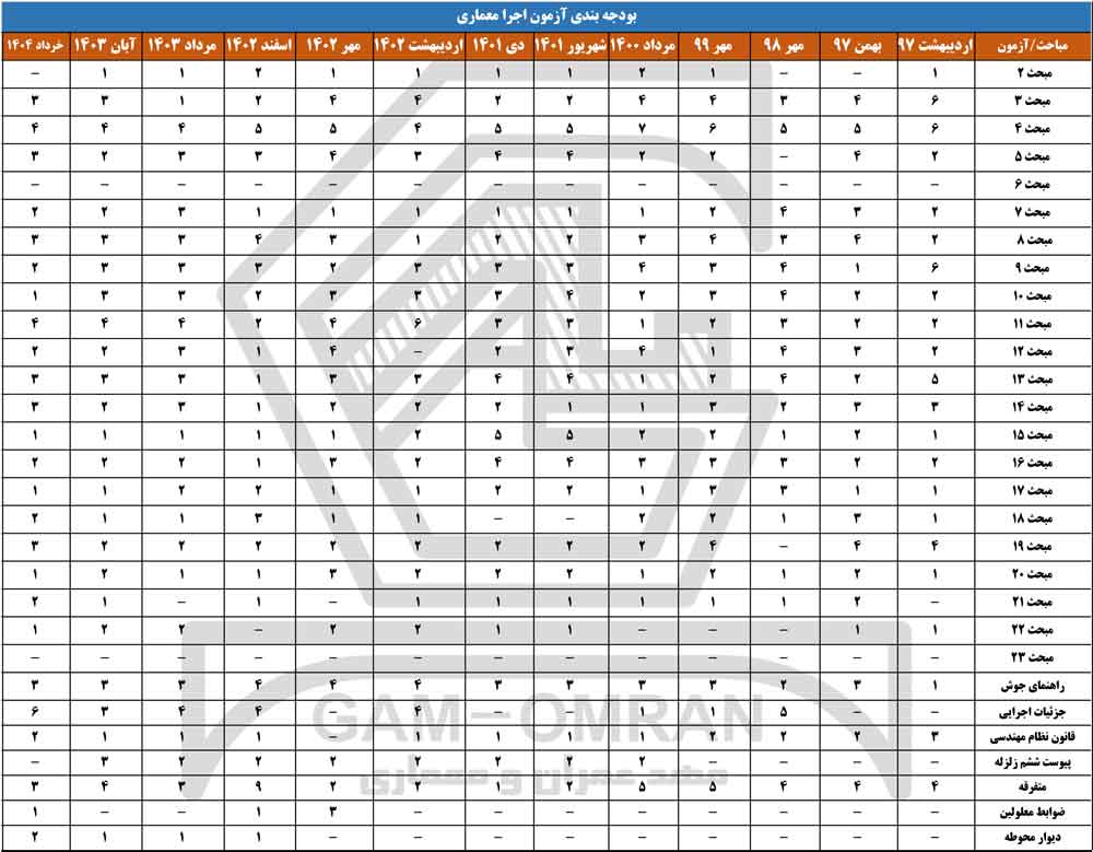 تحلیل سوالات نشان میدهد که برخی مباحث مانند مبحث ۲۱ (پدافند غیرعامل)، مبحث ۴ (الزامات عمومی ساختمان)، مراحل اجرا، مسئولیتهای ناظر و مجری، و نکات مربوط به قراردادها و بیمهها، تقریباً در اکثر دورهها تکرار شدهاند. این یعنی باید سهم بیشتری از زمان مطالعهتان را به این بخشها اختصاص دهید.